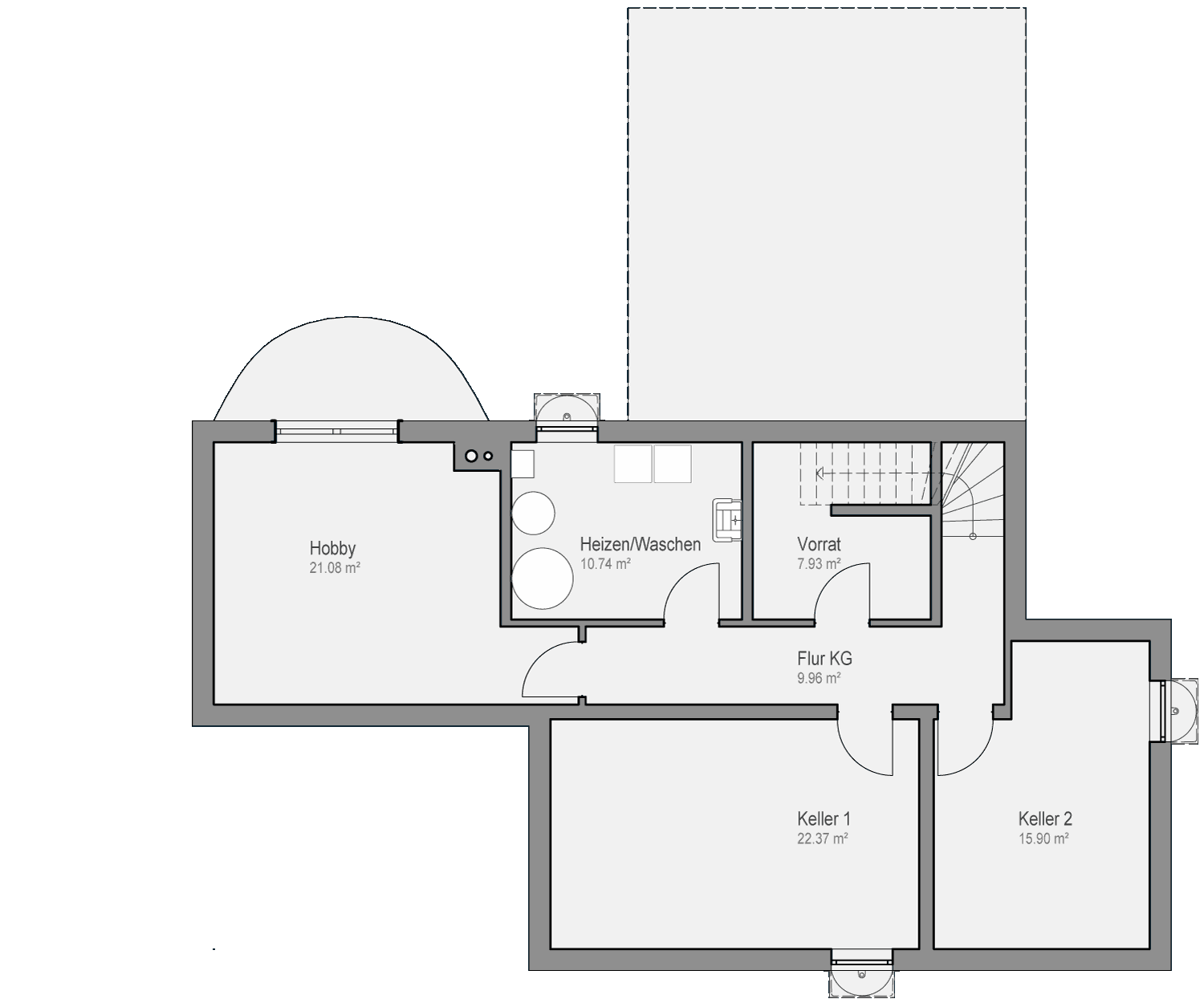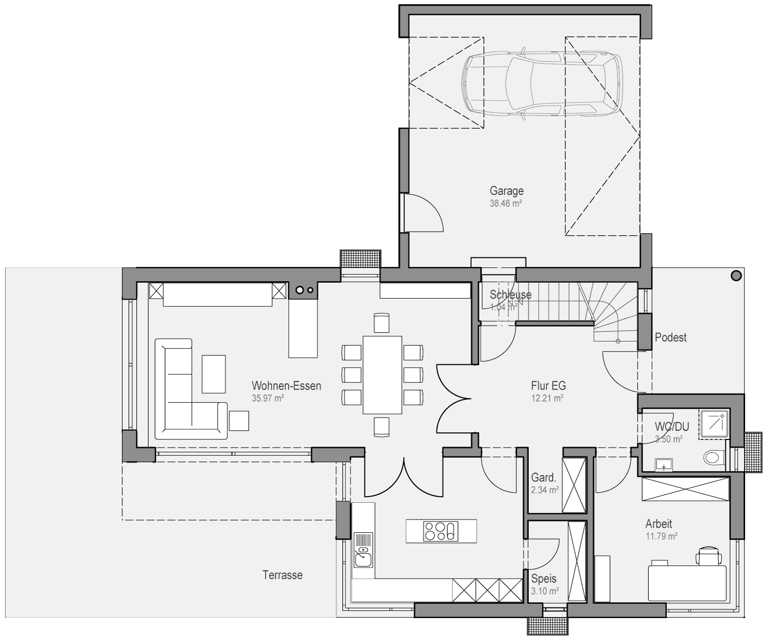 Ein Ansatz des Bauhauses lautet: Bei allem Sinn für Ästhetik darf der praktische Nutzen nicht zu kurz kommen. Diesem Prinzip entspricht die Gestaltung dieses Einfamilienhauses. Auf den Flur im Eingangsbereich folgt ein weiträumiger Wohnbereich mit Essplatz, an den wiederum die geschlossene Küche anschließt. Großflächige Glaselemente im Wohnzimmer lenken den Blick auf die Terrasse und den Garten. Eckfenster in der Küche und im Arbeitszimmer verstärken die moderne, geradlinige Anmutung des Baus und fluten die Räume mit viel Tageslicht. Garderobe und Gästetoilette runden das Raumangebot im Erdgeschoss ab. Über den lang gezogenen Flur im ersten Stock gelangt man ins Elternschlafzimmer mit Ankleide und Bad sowie zwei Kinderzimmer mit Kinderbad.