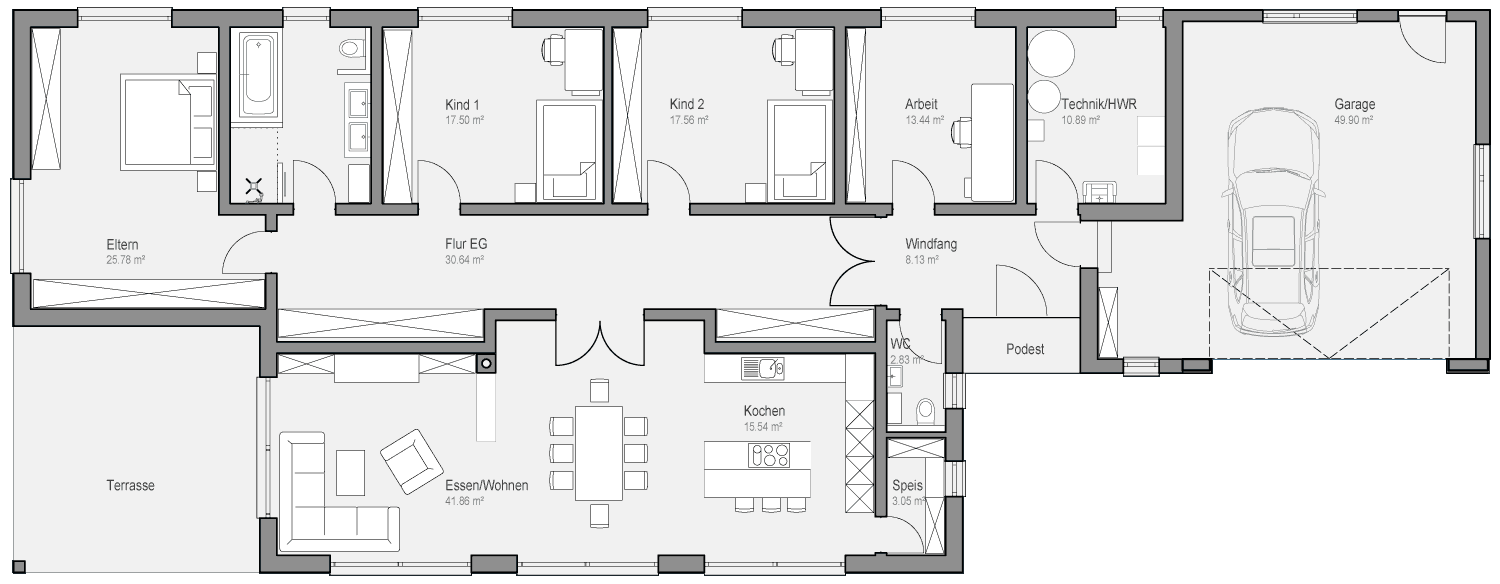 Der großzügig gestaltete Bungalow besticht durch Helligkeit und seine offene Architektur. Die großflächigen, bodentiefen Verglasungen auf der Gartenseite verleihen dem Gebäude eine spielerische Transparenz und versorgen die Wohnräume optimal mit Tageslicht. Das Wohnangebot auf einer Ebene erlaubt kurze Wege und ist eine gelungene Investition in die Zukunft. Die durchdachte Grundrissgestaltung und die barrierefreie Ausführung kommen allen Bauherren entgegen, die auch im hohen Alter noch in den eigenen vier Wänden wohnen möchten. Vor dem Wohnbereich des Bungalows schließt sich nahtlos die geschützt liegende Terrasse an. Dieser gedeckte Sitzplatz bietet viel Platz und lädt zu gemütlichen Stunden im Freien ein.