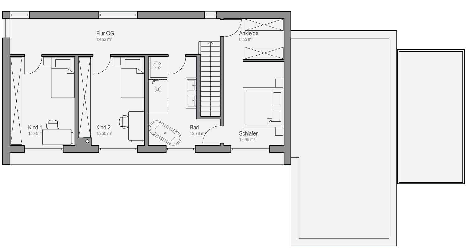 Dieses Einfamilienhaus möchte für seine Bauherren möglichst flexibel sein und es über die Jahre auch bleiben. Beim holzverkleideten Teil des Gebäudes handelt es sich um eine Einliegerwohnung, die zur Vermietung, als Praxis oder Büroraum, für eine Pflegekraft sowie für die heranwachsenden Sprösslinge genutzt werden kann. Im offenen Wohnbereich des Hauptbaus spielt sich das Familienleben ab. Große Glasflächen bringen das Tageslicht herein und geben den Blick auf den Garten frei. Rückzugsorte sind im Obergeschoss untergebracht. Hier verfügt das Haus im Bauhaus-Design über zwei gleich geschnittene Kinderzimmer und ein viel Platz bietendes Bad. Abgerundet wird das Konzept durch ein Elternschlafzimmer, dem eine Ankleide vorangestellt ist.