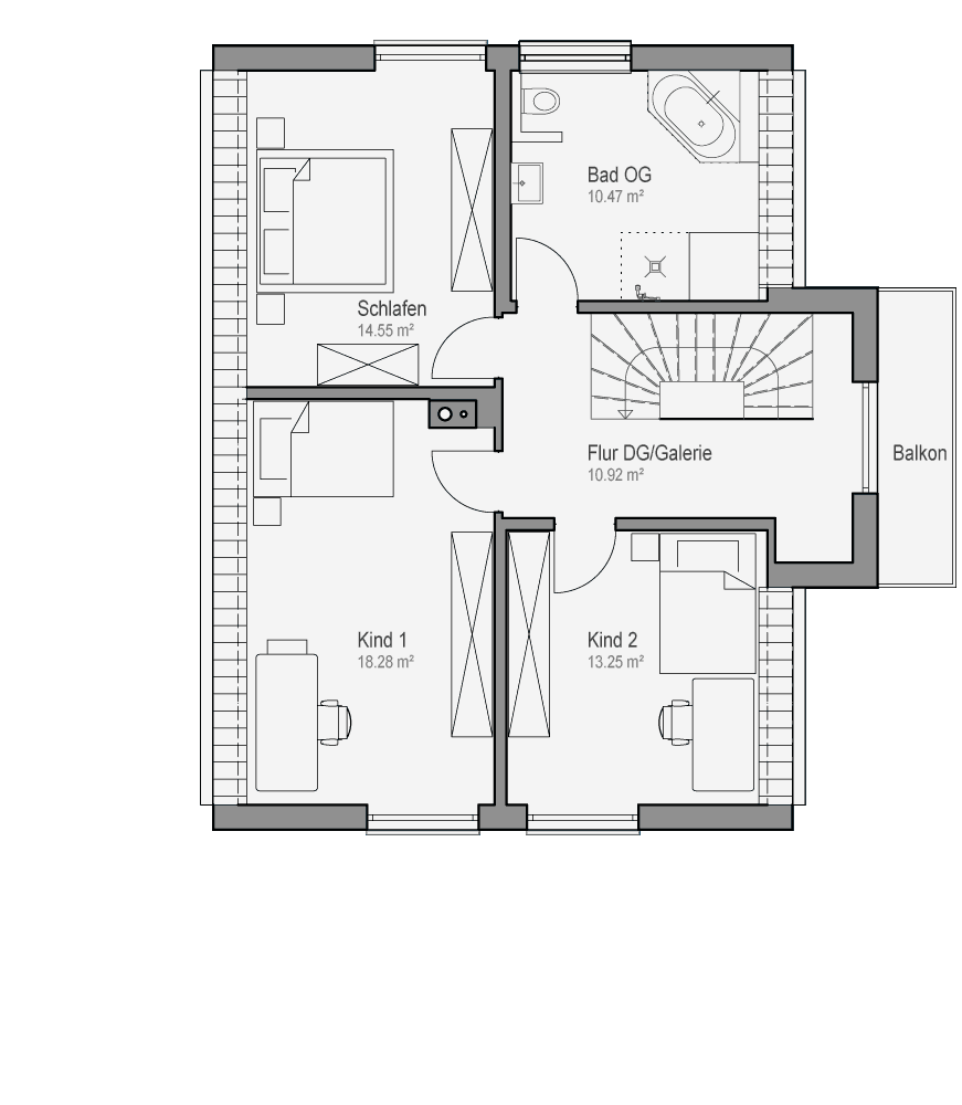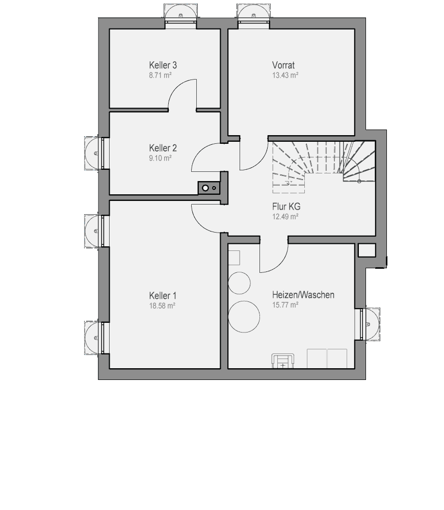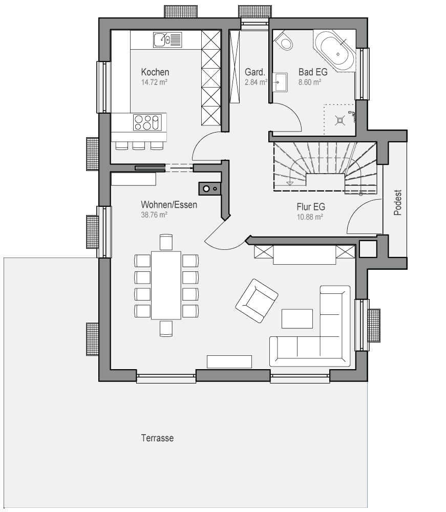 Der Grundriss dieses Einfamilienhauses folgt einer ganz klaren Konzeption: Im Erdgeschoss liegt der Fokus auf dem offen geplanten Lebensraum in L-Form. Dieser bildet das Zentrum des Hauses und ermöglicht jederzeit eine direkte Kommunikation. Neben der geräumigen Küche erstreckt sich hier hauptsächlich der Wohn- und Essbereich über einen Großteil des Stockwerkes. Zahlreiche Fenster sorgen für ein Maximum an natürlichem Licht und verwandeln die untere Etage in einen sehr hellen und wohnlichen Bereich. Im Obergeschoss bieten drei Zimmer und ein großes Familienbad genug Raum für den bewegten Alltag eines 4-Personen-Haushalts. Dank Keller steht viel Stauraum und Platz für Hobbys zur Verfügung.