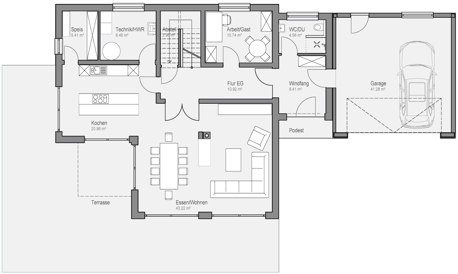 In Richtung Terrasse öffnet sich die Fassade im Erdgeschoss maximal dank der zahlreichen großen Glasschiebetüren. Im Sommer ermöglichen sie es, die Gartenfront bei schönem Wetter weit zu öffnen. Über einen Teil der Terrasse schiebt sich das Obergeschoss. So entsteht scheinbar spielerisch ein geschützter Sitzplatz. Neben dem kombinierten Koch-, Ess- und Wohnbereich stehen in der unteren Etage ein Arbeitszimmer, ein Gästebad und ein Hauswirtschaftsraum zur Verfügung. Im Obergeschoss dient die Ankleide als Zugang zum Elterntrakt. Von hier gehen zu beiden Seiten das elterliche Schlafzimmer und Bad ab. Zwischen den beiden Kinderzimmern ordnet sich ein zusätzliches Bad ein, das über den Flur betreten wird.