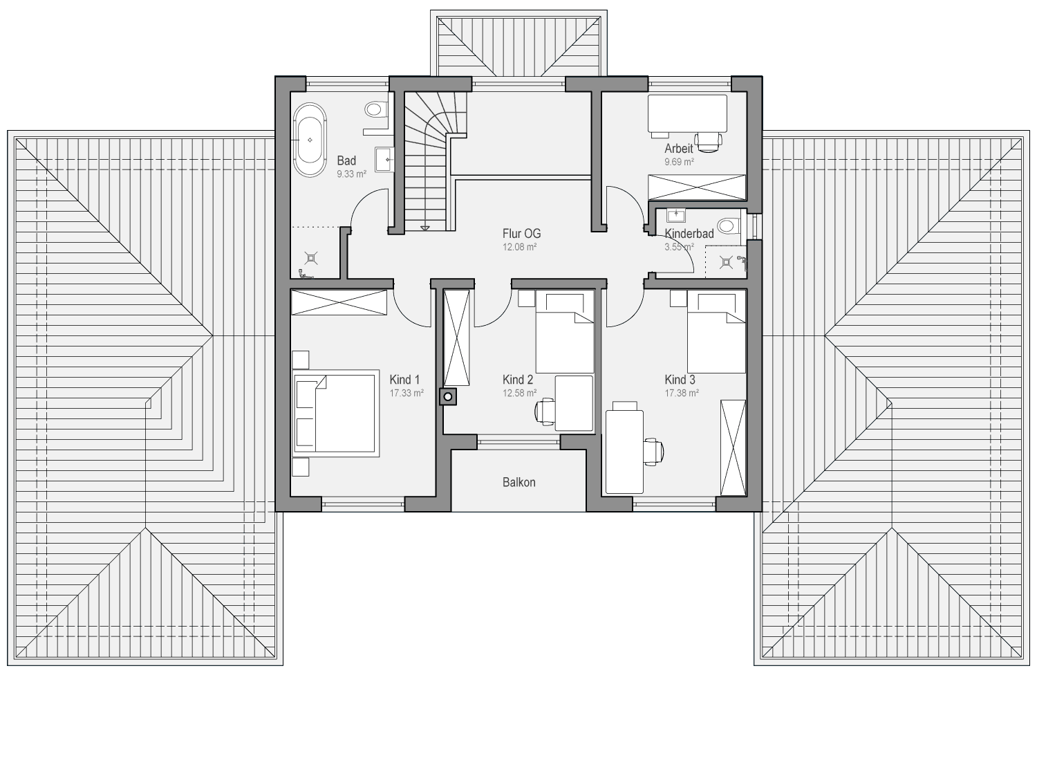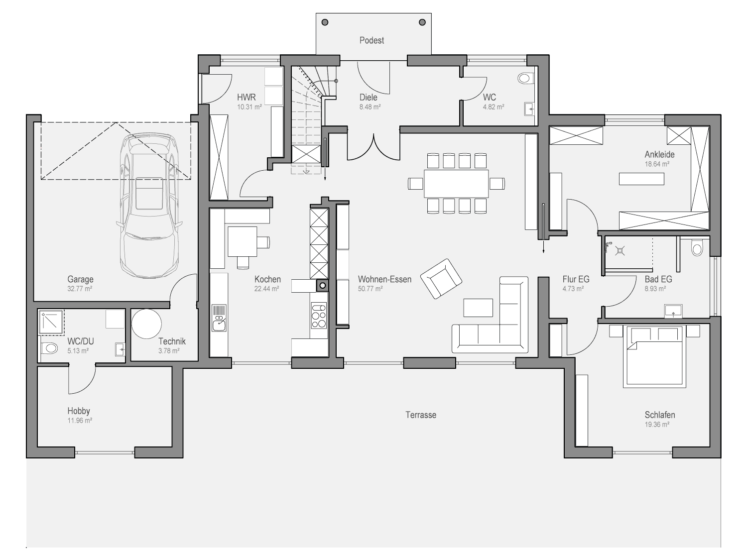 Das Raumprogramm im Erdgeschoss schließt Wohn- und Esszimmer, Küche, Hauswirtschaftsraum und Gästetoilette ein. Hinzu kommt ein eigener Trakt in einem der Seitenflügel. Vom Wohnzimmer abgehend schirmt ein kleiner Flur diesen Bereich mit Schlafzimmer, Bad und Ankleide zusätzlich ab. Im Gegenstück auf der anderen Gebäudeseite ist neben Garage und Technikraum ein Hobbyraum mit Dusche und WC untergebracht. Vom opulent verglasten Wohnbereich genießt man einen ungehinderten Blick in den Garten mit Pool. Aus der angedeuteten U-Form des Erdgeschosses ergibt sich eine geschützte Terrasse als großes „Zimmer“ unter freiem Himmel. Das Obergeschoss ist dem Nachwuchs gewidmet. Drei Kinderzimmer, zwei Bäder und ein Arbeitszimmer bieten ausreichend Raum zur persönlichen Entfaltung.