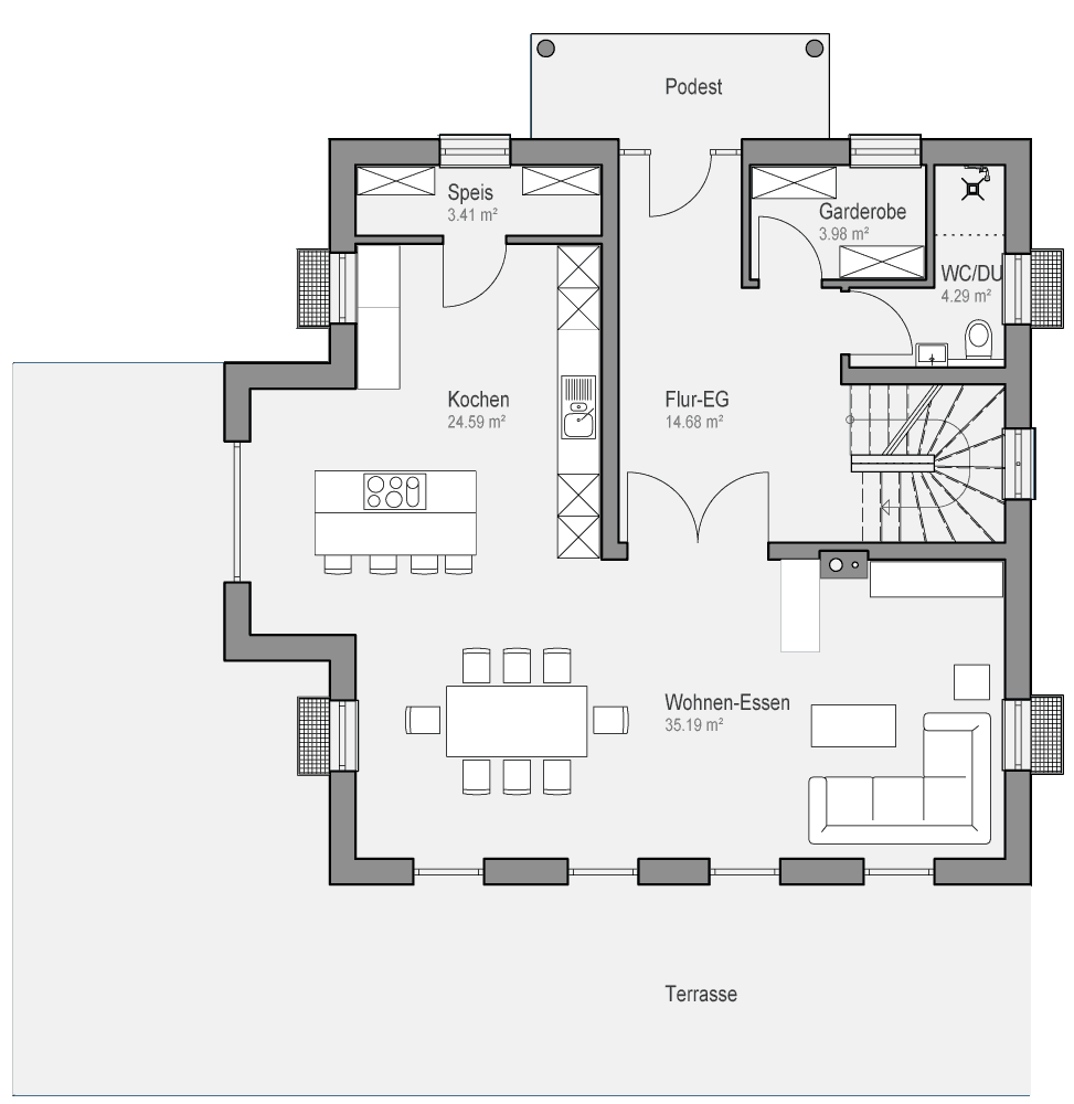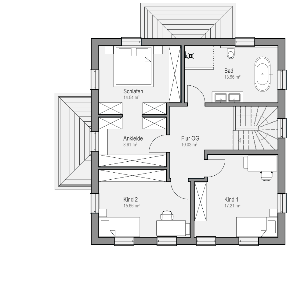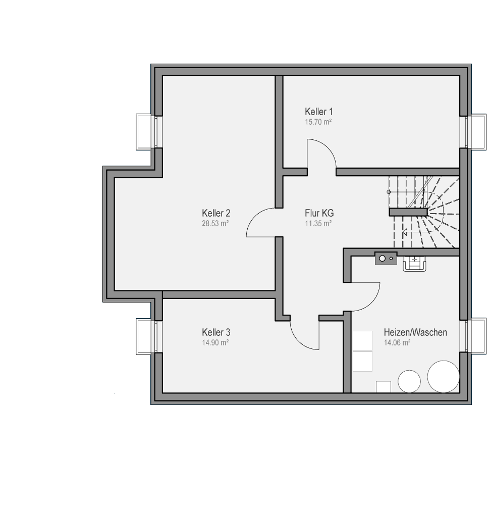 Dank des quadratischen Grundrisses präsentiert sich diese Villa als klassisches Beispiel für gelungene Stadthaus-Architektur. Im Erdgeschoss befinden sich alle gemeinsamen Bereiche: offene Küche mit angeschlossener Speisekammer, Esszimmer, Wohnraum, Garderobe und Gästebad mit Dusche. Der kleine Erker auf der Gartenseite ist ein schöner Blickfang und eröffnet gleichzeitig neue Möglichkeiten für die Raumaufteilung. Die Sprossenfenster unterstützen das mediterrane Flair und verleihen den Räumen ein von Licht erfülltes Ambiente. In der oberen Wohnebene befinden sich zwei Kinderzimmer und ein Schlafzimmer, das über die Ankleide betreten wird. Ein großes Bad komplettiert dieses Geschoss. Die Unterkellerung erweitert das Platzangebot um drei Kellerräume mit viel Stauraum sowie einen Heiz-/Waschraum.