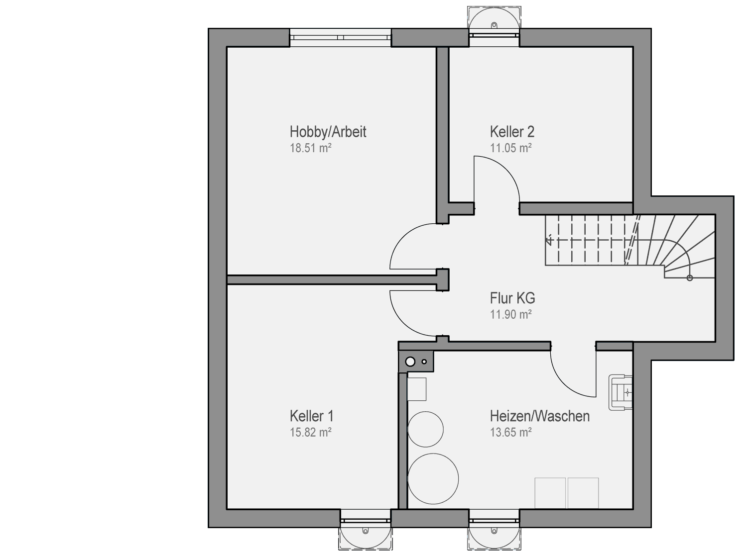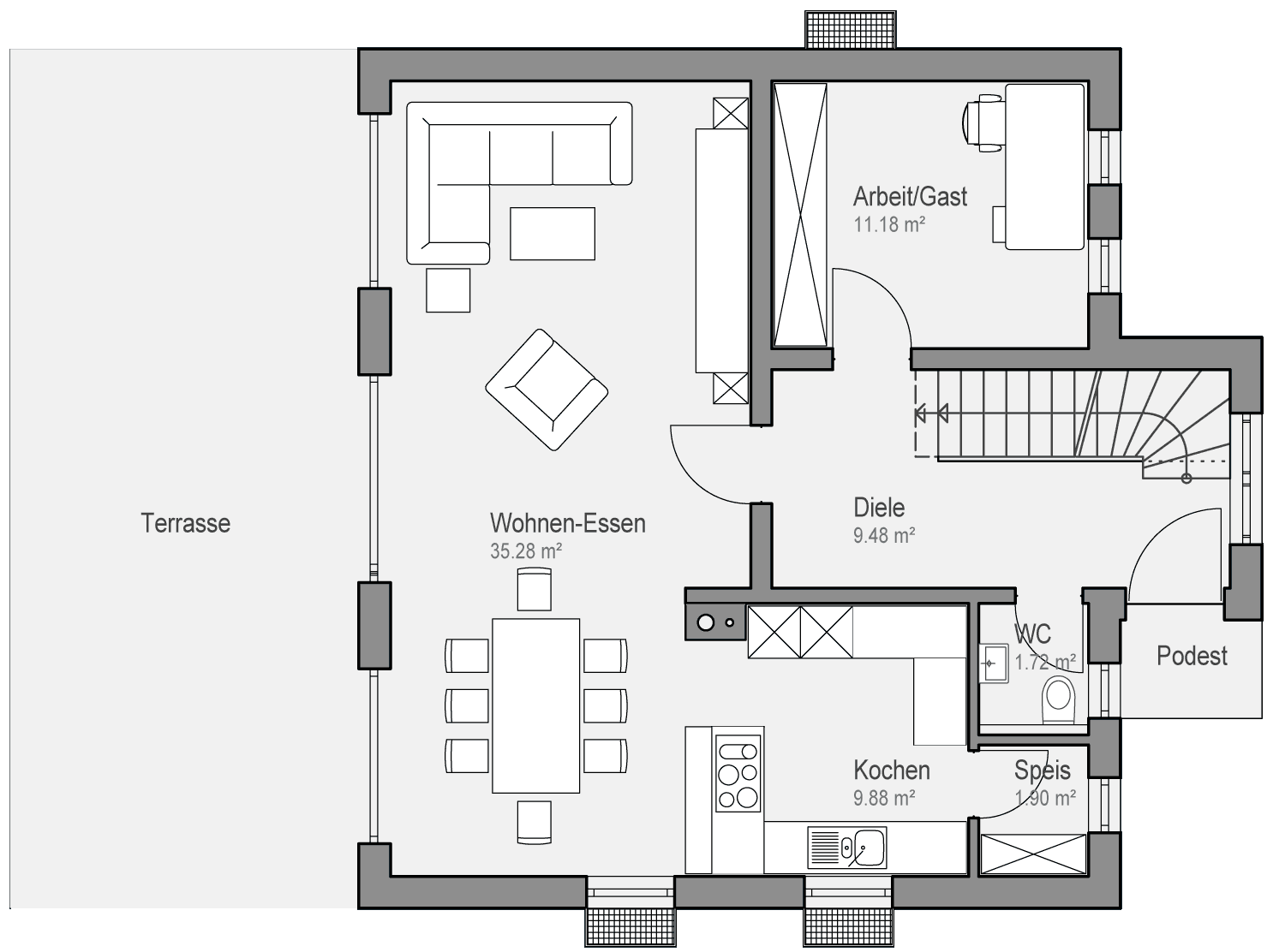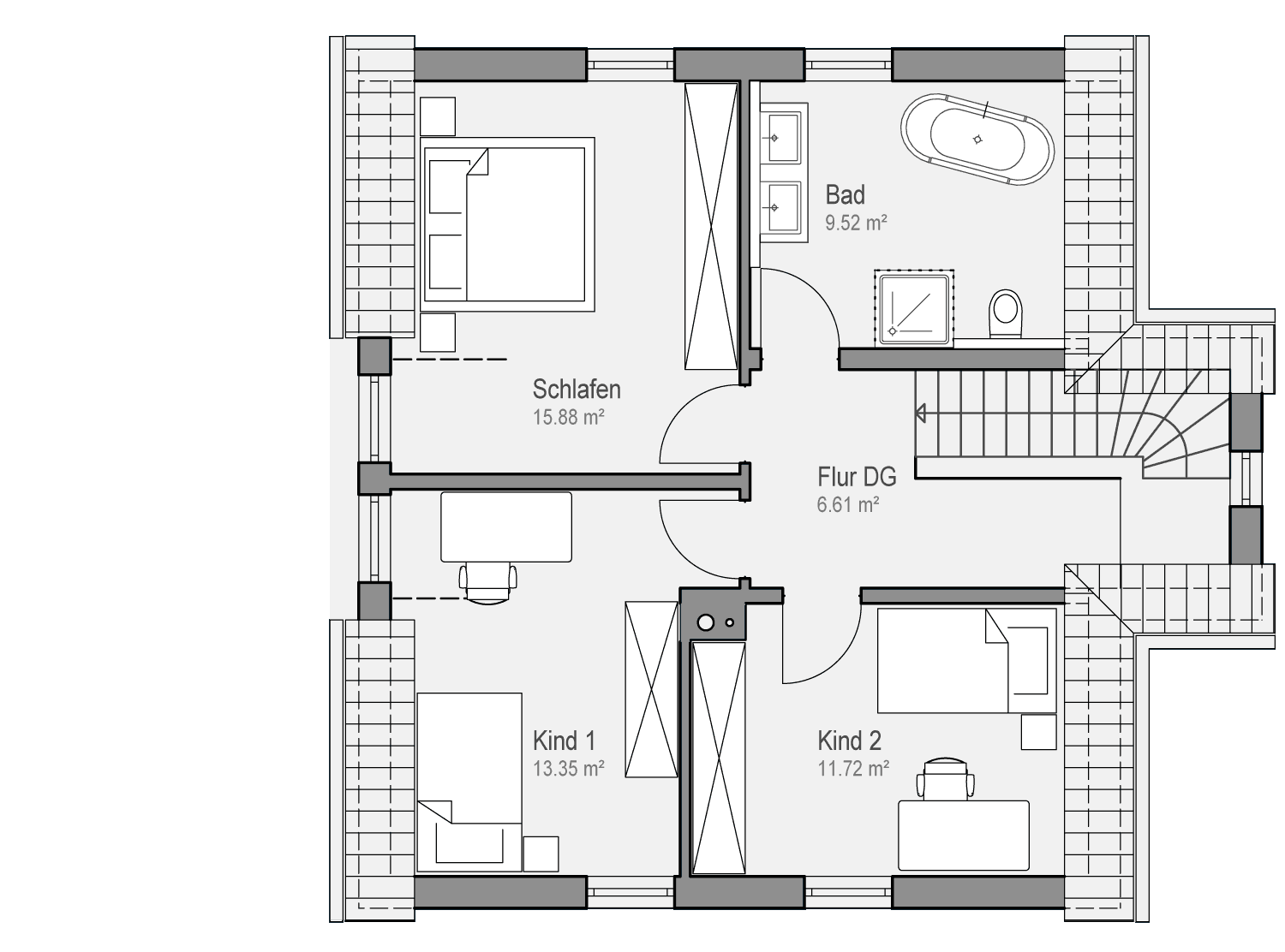 Das weitgehend offen gestaltete Erdgeschoss mit Wohnraum, Essbereich sowie Küche mit separater Speisekammer wird durch einen einfachen L-Winkel gegliedert. Ein weiteres Zimmer und eine Gästetoilette, die jeweils von der Diele aus betreten werden, ergänzen die untere Etage. Große Freiheit garantiert die Galerie, die das Erd- zum Dachgeschoss öffnet und so ein ganzheitliches Raumerlebnis des Hauses ermöglicht. Die leicht geschwungene Treppe führt in den Rückzugsbereich mit elterlichem Schlafzimmer und zwei Kinderzimmern. Das Badezimmer trägt dank seiner vorausschauend geplanten Maße zur Stressreduktion bei der familiären Morgentoilette bei. Durch die vielen Fenster wirken alle Räume sehr hell und werden mit viel Tageslicht bedacht.