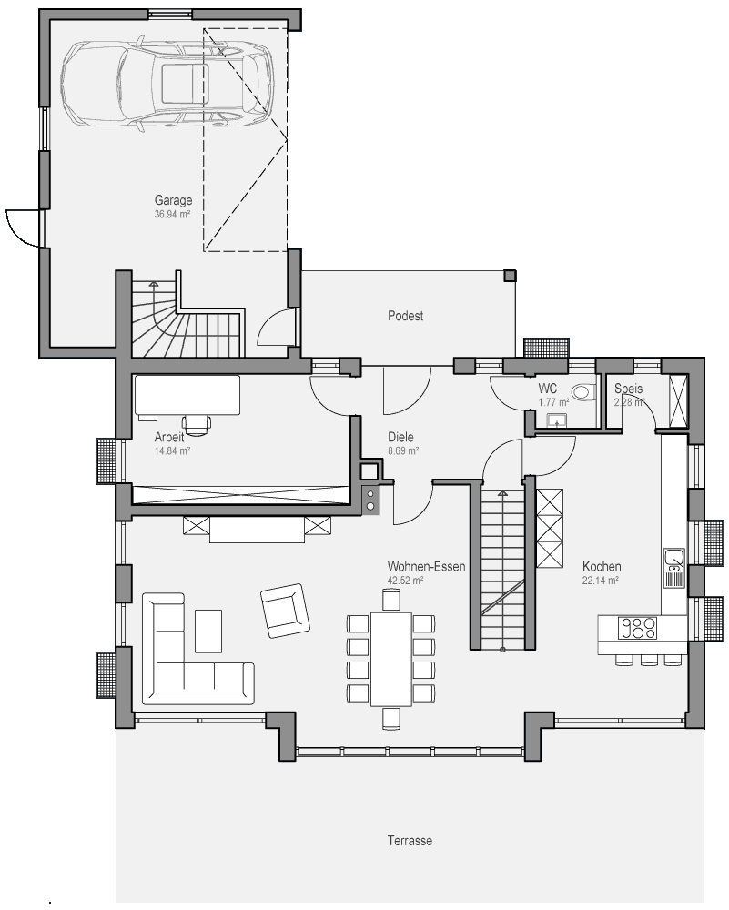 Drinnen oder draußen? Wer darauf antworten möchte, muss bei diesem Bau erst einmal überlegen. Durch die großflächige Glasfront werden die Raumgrenzen zwischen innen und außen optisch fast komplett aufgehoben. Betreten wird das Haus durch eine Diele, die in den Wohnbereich führt. Dort befindet sich die Küche sowie das angeschlossene Ess- und Wohnzimmer. Große Glasschiebetüren rechts und links der hohen Glasfront führen auf die Terrasse und in den Garten. Arbeitszimmer und Gästetoilette komplettieren das Erdgeschoss. In der oberen Etage dient das mittig angeordnete Badezimmer als Puffer zwischen Elterntrakt und den beiden Kinderzimmern. Von der kleinen Galerie im Flur sieht man hinab auf den Essplatz – Kommunikation ausdrücklich erwünscht.