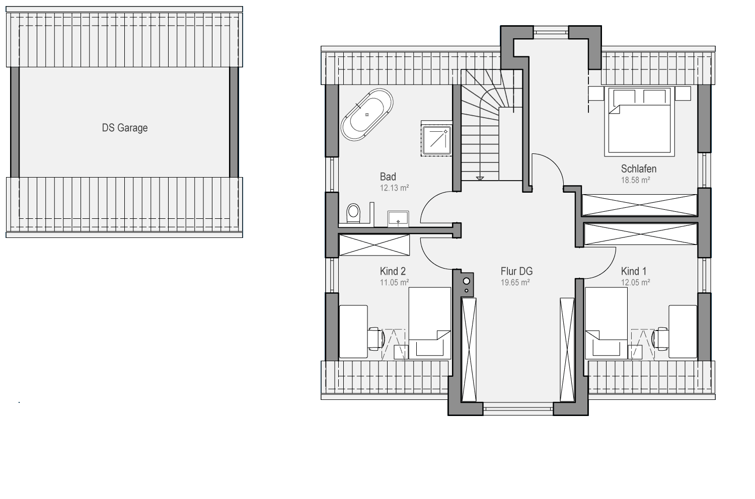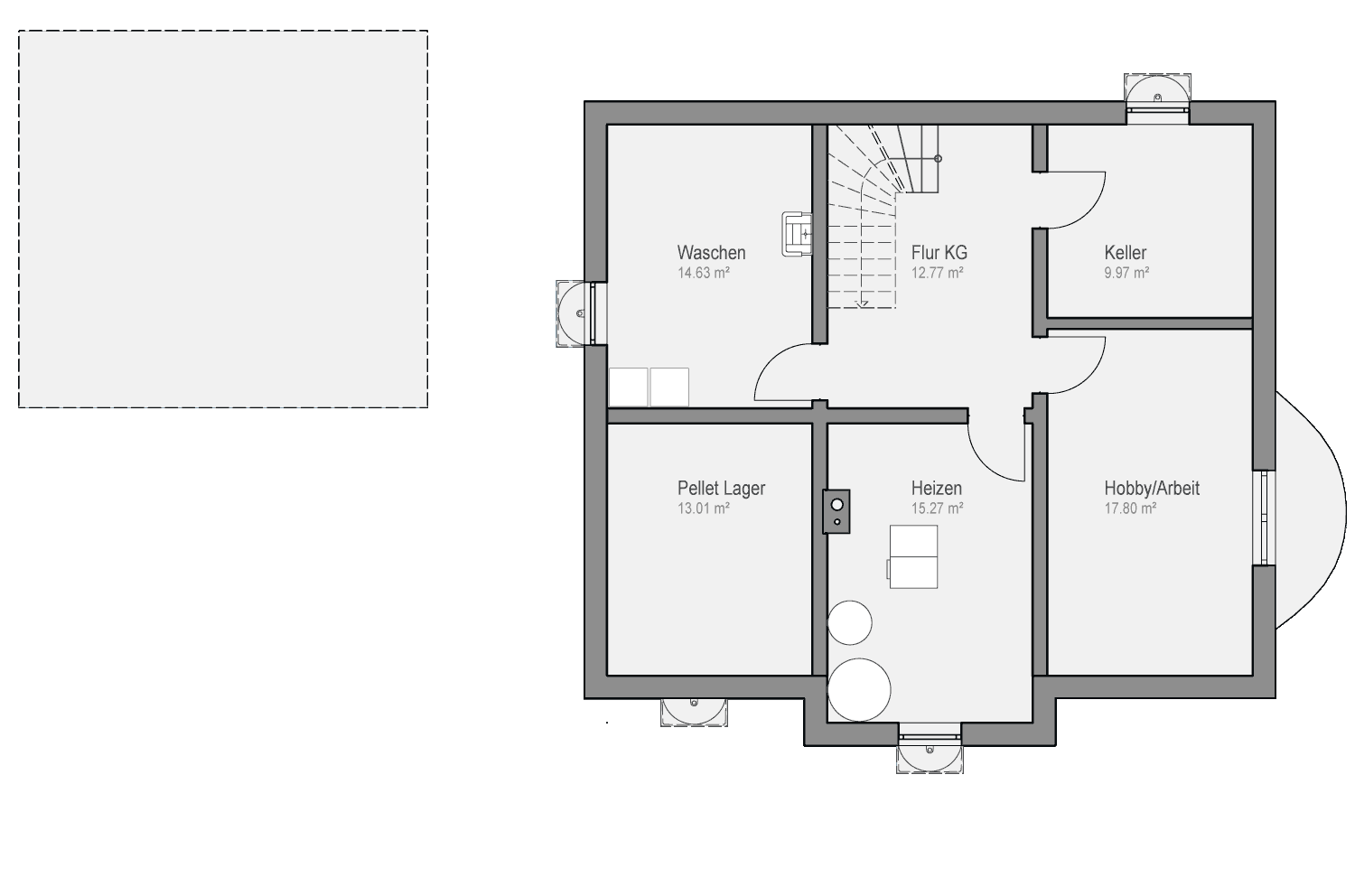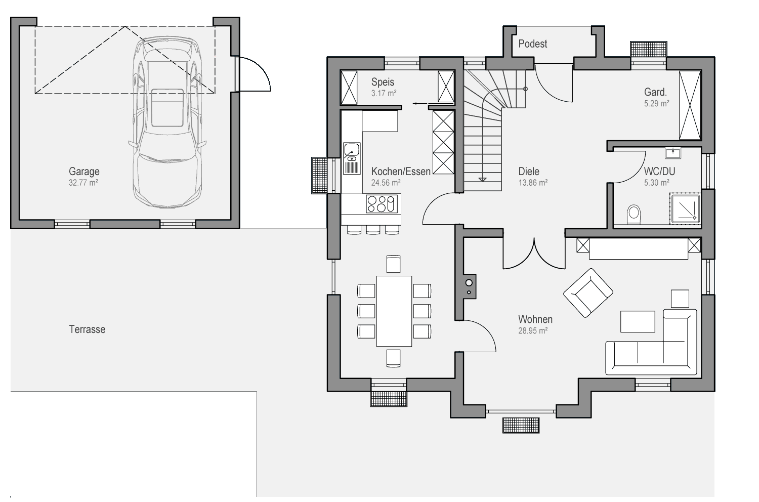 Die Planung dieses Einfamilienhauses zeigt viel Liebe zum Detail. Zum stimmigen Gesamtkonzept gehört es, dass hier nicht mit einem völlig offenen Grundriss im Erdgeschoss gearbeitet wird. Vielmehr ergibt sich durch das abgeschlossene Wohnzimmer bereits ein erster Rückzugsort. In der großen Wohnküche mit praktischer Speisekammer und am gemütlichen Essplatz herrscht jedoch immer ein Gemeinschaftsgefühl. Die moderne Essbar trennt beide Bereiche nur dezent und ist ein beliebter Treffpunkt für alle Familienmitglieder. Direkt von der Diele mit Garderobe geht das Gäste-WC mit Dusche ab. Für die gebotene Privatsphäre im ersten Stock sorgt ein geschlossenes Raumkonzept. Drei Schlafräume und ein Familienbad schenken reichlich Entfaltungsspielraum.